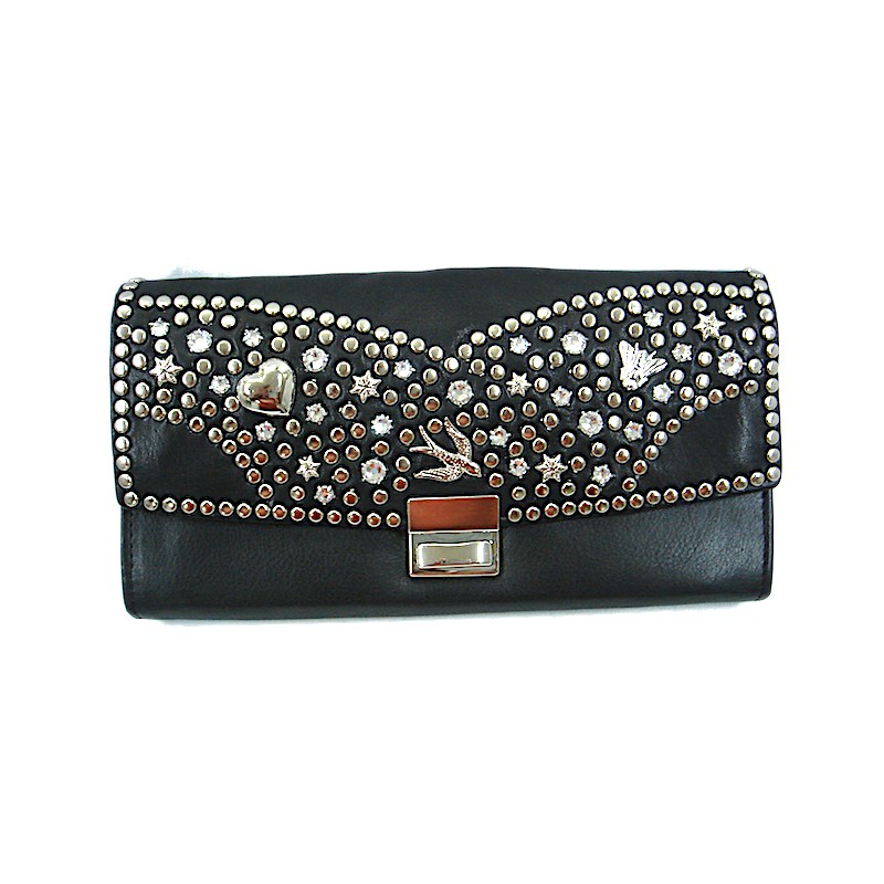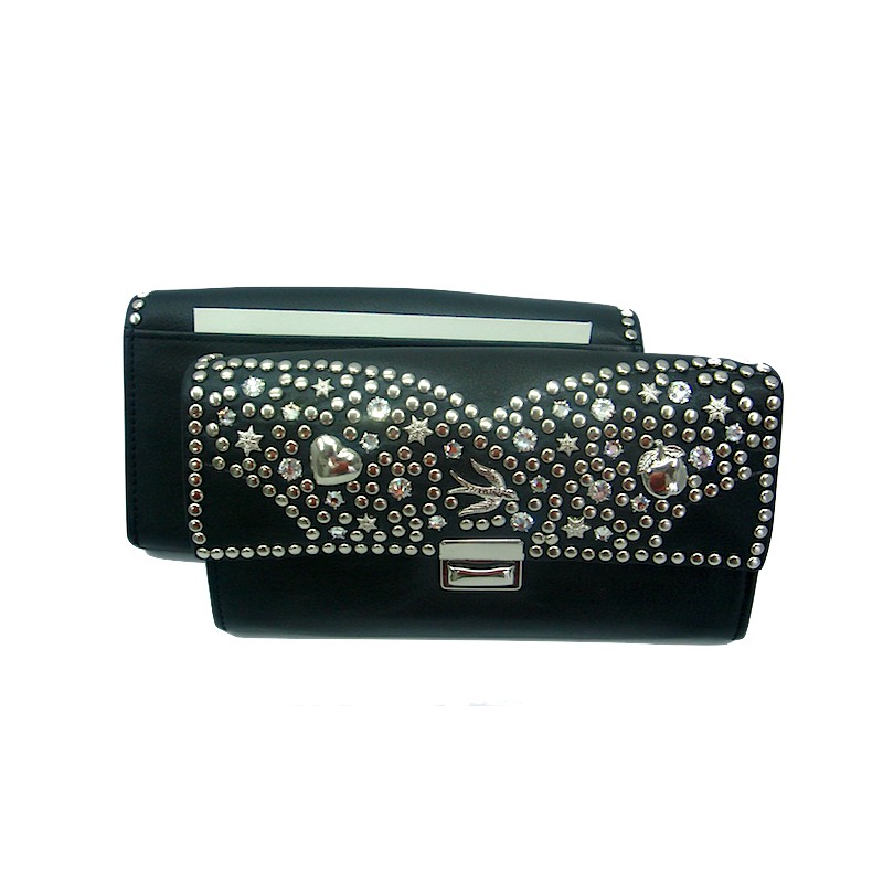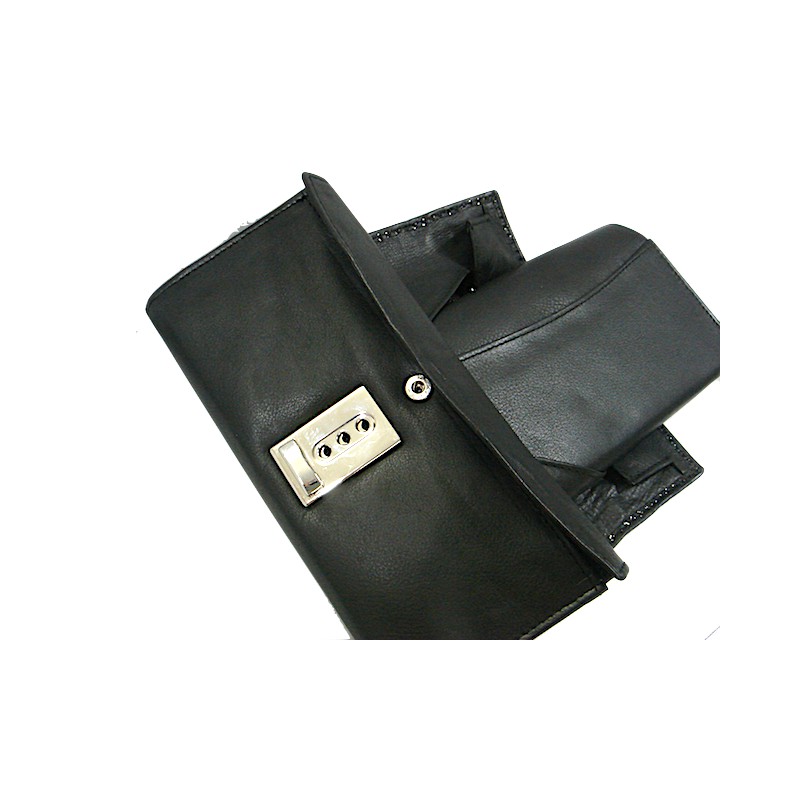 Kellnerbörse Klassik: 4 große Geldscheinfächer großes Hartgeldfach mit verstärkten Nylonboden. 1 Klappenfach mit 3 Kartenfächern und ein Steckfach auf der Rückseite . Rindleder mit Nieten und Strass verziert.