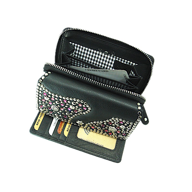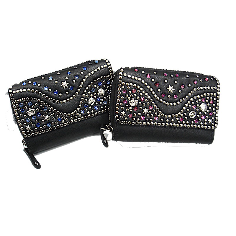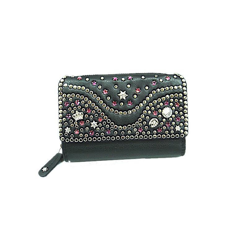 Wir bieten hier eine große Geldbörse mit viel Platz aus weichen Rindleder.Die Klappe ist mit echten Swarovski Steinen und Nieten veredelt!Diese Börse hat einen Rif Schutz gegen auslesen der Kreditkarten!